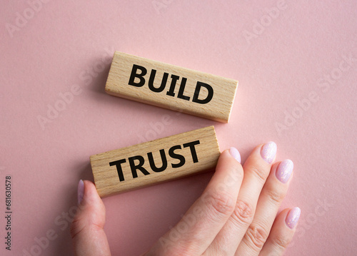 Build trust symbol. Wooden blocks with words Build trust. Beautiful pink background. Businessman hand. Business and Build trust concept. Copy space.
