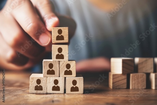 Building a Strong Team: A hand strategically assembles wooden blocks into a hierarchical pyramid, each adorned with a human icon, symbolizing team building, leadership, and organizational growth.