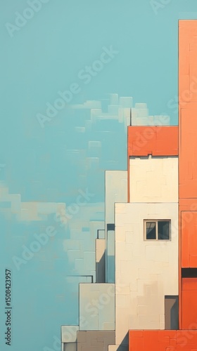 residential area, colored background, building exterior, built structure, architecture, illustration, landscape, minimalist, simplified, background, aesthetic, wallpaper, abstract, building, closeup, outdoors, painting, acrylic, canvas, facades, nature, sparse, colours, empty, house, style, urban, blue, city, town, wall, art, day, red, sky