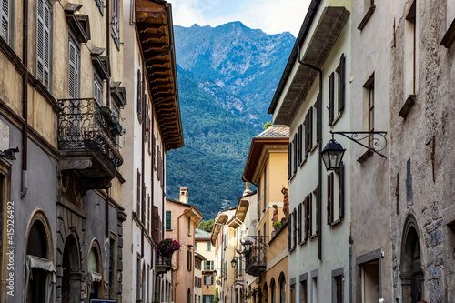 Buildings in old town against mountain, Valchiavenna, Chiavenna, Province of Sondrio, Lombardy, Italy