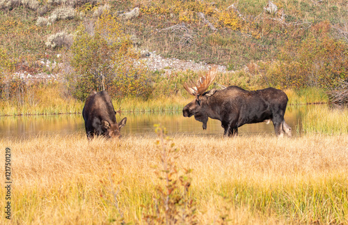 Bull and Cow Moose Rutting in Grand Teton National Park Wyoming in Autumn