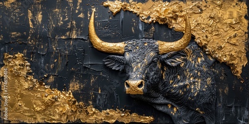 Bull impasto painted illustration, black and golden, representing financial market trend