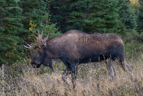 Bull moose walking into the forest