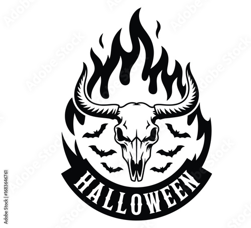 bull, skull, horn, flames, halloween, badge, skittish, horror, creepy, scarey, undead, skeleton, bone, night, darkness, terror, evil, haunt, spirit, phantom, gothic, monster, shadow, death, beast, animal, strong, fire, vector, design, illustration
