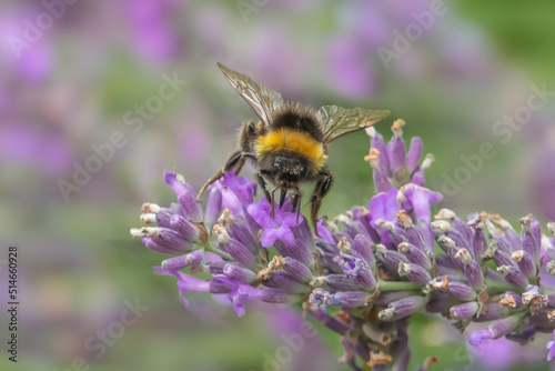 Bumble bee sitting on and pollinating purple lavender flowers