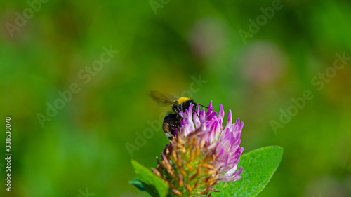 Bumblebee collects pollen and nectar on a clover flower.