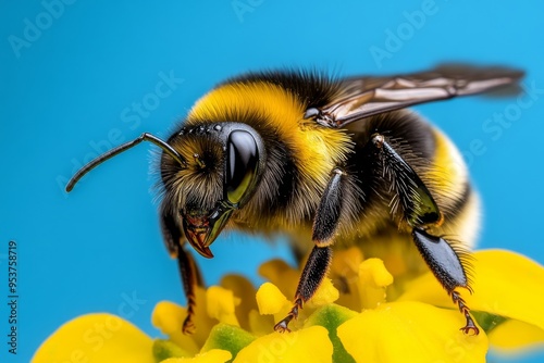 Bumblebees, under a blue sky, vibrant activity fill the air with their gentle hum