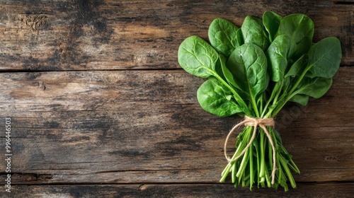 Bunch of fresh spinach leaves tied with twine on a rustic wooden background, creating a farm-to-table concept.