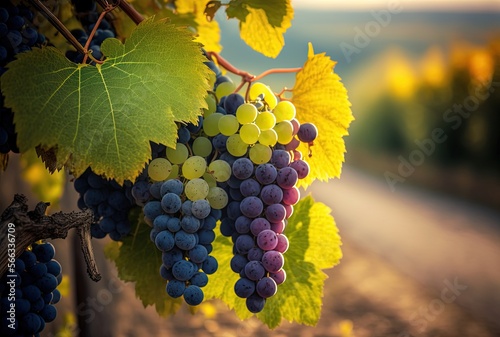 bunch of grapes in orchard, idea for agricultural and fruitfulness theme concept background wallpaper, purple grapes Generative Ai