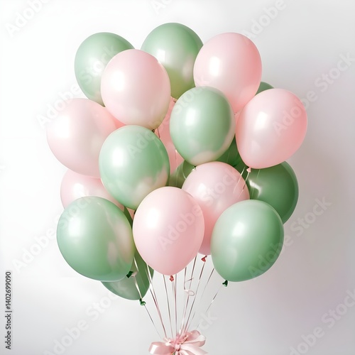 balloon, celebration, party, event, festive, happy, joy, decoration, decor, pastel, pink, green, mint, ribbon, bow, isolated, studio, white background
