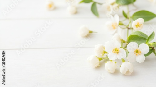Bunch of white flowers arranged on a white table creating a minimalist aesthetic