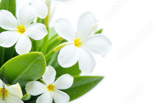 bunch of white flowers with green leaves on a white background