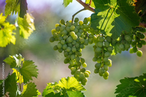Bunch of white grapes on a sunny day on a vineyard. Grape harvest season.