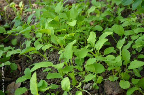 bunch the small ripe green spinach plant seedlings in the garden.