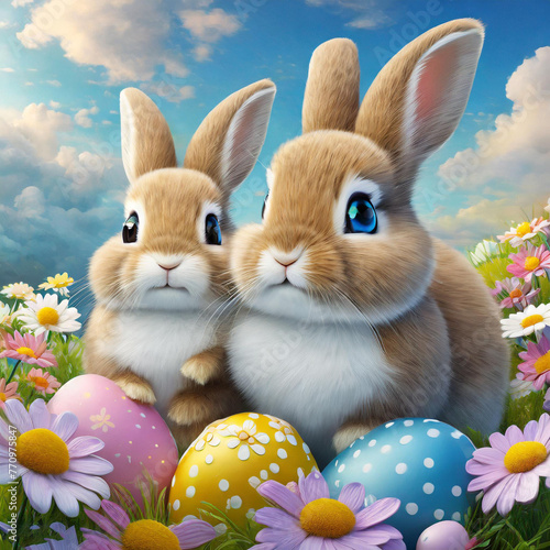 "Bunny Bliss: Whimsical Family Frolic Among Floral Fields, Peering with Big Eyes, Nestled by Painted Easter Eggs