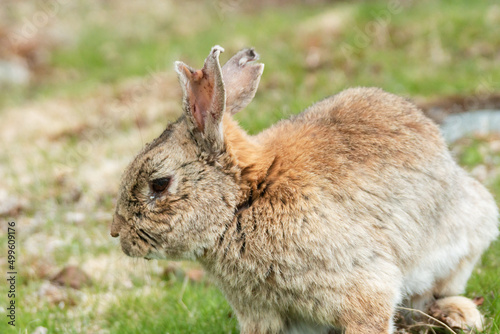 Bunny rabbit jumping free outdoors at farm.