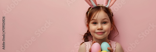 Bunny-themed Easter banner, happy kid, egg decorating, family joy