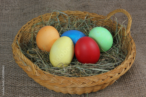 bunte Ostereier in einem Korb mit Heu