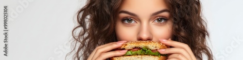 woman, burger, food, eating, delicious, tasty, appetence, juicy, hamburger, sandwich, meal, lunch, dinner, fast food, closeup, portrait, model, girl, brunette, curly hair, expression, enjoyment, satisfaction, pleasure, lifestyle, healthy eating, food photography, eatery, cafes, menu, advertising, marketing, commercial, brown hair, beautiful, pretty, attractive, happy, smile, content