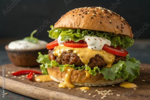 burger and fries beef burger with lettuce, cheese and onion served on cutting board on a black wooden table, with copyspace.
