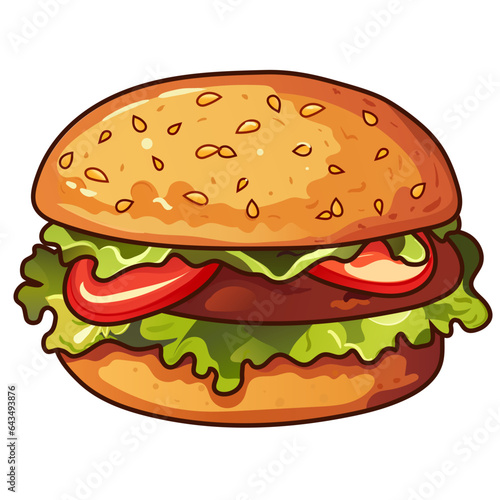 Burger. Delicious juicy burger with patty, cutlet, lettuce, sauce and tomato. Sesame on soft ruddy bun. Fast food, street, takeaway, harmful, high calorie, tasty, beef, chicken, fresh vegetables