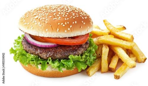 burger, hamburger, fries, french fries, lettuce, tomatoes, onion, bun, sesame seeds, fast food, food, meal, lunch, dinner, sandwich, fried, unhealthy, delicious, tasty, isolated, white background, side dish, snack, junk food, patty, meat, bread, vegetable, carbohydrate, cooked, cookery