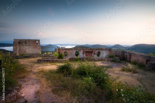 ruin, castle, pfalz, rhineland-palatinate, famous, hike, masonry, aged, sunset, countryside, fog, rain, heaven, summer, view, panorama, historic