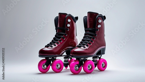quad, skate, roller, burgundy, red, fuchsia, pink, black, lace, glossy, vibrant, bold, high, contrast, stylish, product, photo, white, background, isolated, clean, fashion, footwear, modern, sharp, detail, colourful, sport, trendy, studio, high-coloured, energetic, edgy, statement, unisex, sleek, cool, polished, aesthetic, unique, design
