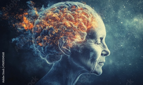 burning, brain, elderly, woman, profile, fire, cosmic, abstract, head, aged, wrinkle, texture, space, glowing, ember, surreal, fantasy, mystical, aethereal, digital, art, imagination, mind, soul, energy, power, transformation, ageing, decay, rebirth