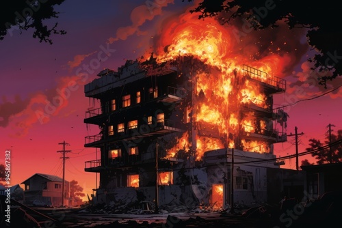 building, burning, architecture, aesthetic, anime, fire, wallpaper, balefire, japan, darkness, person, illustration, explosion, drawing, sunset, cloud, house, smoke, sky, factory, graphic, flames, human, night, 90s, building exterior, destruction, digital artwork, industry, outdoors, style, damaged, built structure, hand-painted, demolition, pollution, wildfire, evening, heat, demolished, smokestack, utility pole, warning sign, residential area