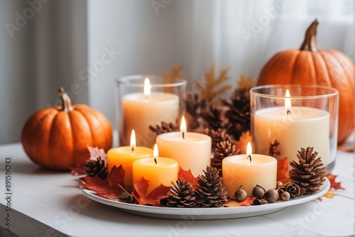 Burning candles on the whit table with the autumn decor in the living room. Cozy Autumn Home Decor