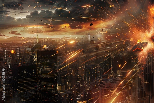 Burning comets and meteors streak across the sky, hurtling towards Earth with fiery intensity, illuminating the darkness of space