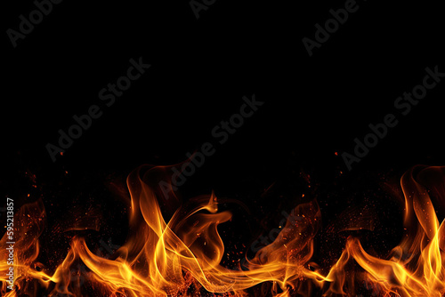Burning fire flame on black background with copy space. Created with Generative AI Technology