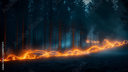 Burning Fire Trail Through Dark Forest at Nighttime with Glowing Embers Sparks and Soft Blue Background