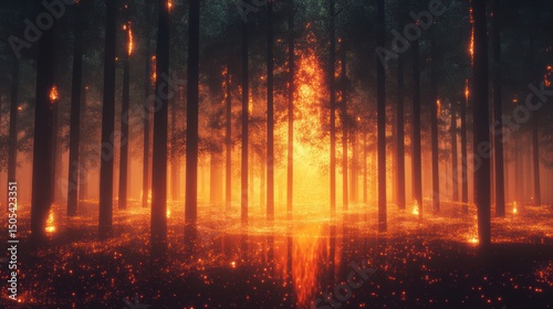 forest, fire, tree, flames, glow, light, dark, mysterious, orange, skittish, burning, nature, timberland, wood, autumn, fall, night, scene, landscape, vibrant, warm, colours, magic, fantasy, surreal, aethereal, ambience, glowing, digital, art, high-coloured, illustration, artistic, imagination, painting, treeline, mist, fog, beautiful, scarey