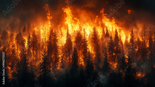 Burning forest in the woods, with thick smoke and flames engulfing the trees. Natural disaster.