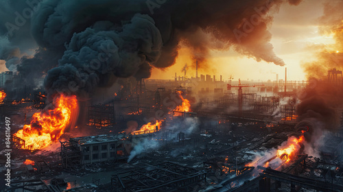 Burning industrial site, intense flames and thick smoke, city skyline in the background.