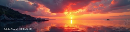 Burning orange sky reflects on tranquil coastal waters, creating a breathtaking spectacle, ocean, view, shore