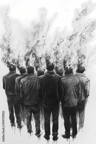 Burnout, Monochrome Illustration of People with Smoking or Burning Heads in Formal Attire, Haunting and Surreal Artwork with a Dark, Abstract Conceptual Style