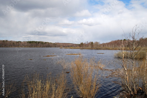 Bushes on the lake. Early spring, snow in places lies on the ground. Bushes grow on the shore of the lake, they are flooded with melt water. They have thin long branches yet without leaves.