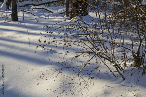 Bushes physocarpus kalinolistnogo (physocarpus opulifolius) in the winter forest. Russia.
