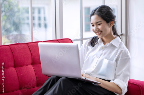 business & social distancing concept: A happy lady work at home and uses a laptop to communicate in her business