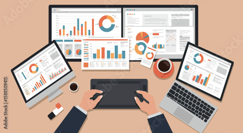datum, business, visualisation, chart, graph, statistic, information, analysis, report, presentation, marketing, finance, sale, strategy, planning, growth, success, progress, performance, dashboard, monitor, screen, computer, laptop, tablet, hot drink, workspace, office, desk, table, hand, pen, stylus, digital, technology, modern, flat, design, illustration, vector, infographic, diagram, pie chart, bar chart, trend