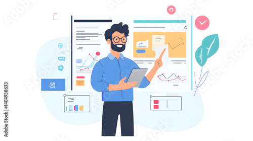 Business analytics presentation: A male business professional in an engaging demonstration of business analytics, with graphics and charts in a futuristic scene.