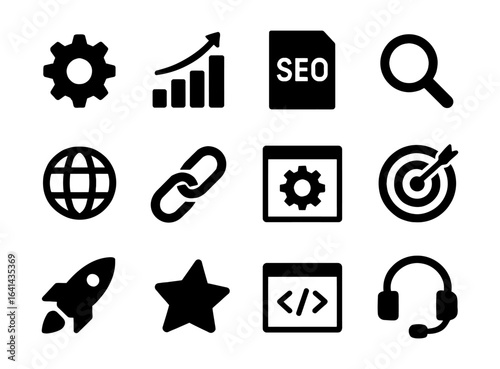 silhouette, icon, gear, graph, search, web, marketing, technology, business, globe, link, target, rocket, star, coding, headset, black, white, symbol, simple, minimal, interface, set, network, cyberspace, digital, connection, communication, tool, growth, design, optimization