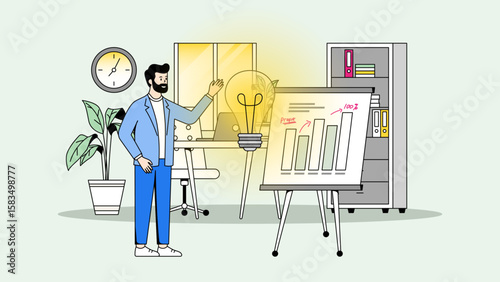 Business Brainstorming Illustration. Office Worker with Light Bulb, Creative Ideas, Imagination, Innovation Concept. Flat Cartoon Graphic for Banner, Presentation, Web or App Design.