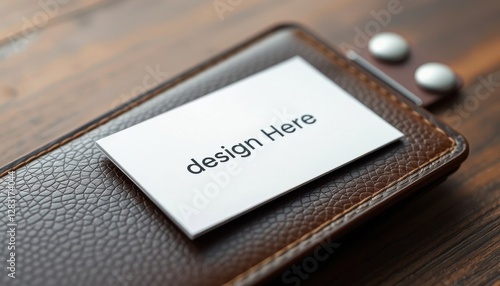 Business card - mockup for text or logo, placed on top of a textured leather wallet. Close-up shot, shallow depth of field, elegant and professional atmosphere, realistic leather and card textures