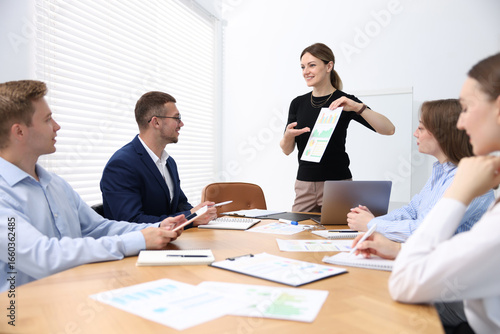 Business coach giving presentation to group of people in office