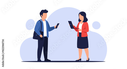 business, colleague, collaboration, teamwork, meeting, communication, technology, laptop, smartphone, mobile phone, man, woman, professional, office, work, modern, design, illustration, vector, people, corporate, partnership, discussion, connection, networking, digital, productivity, success, efficient, businessperson