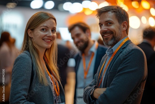 Business colleagues talking on break during an education event in convention center, Generative AI